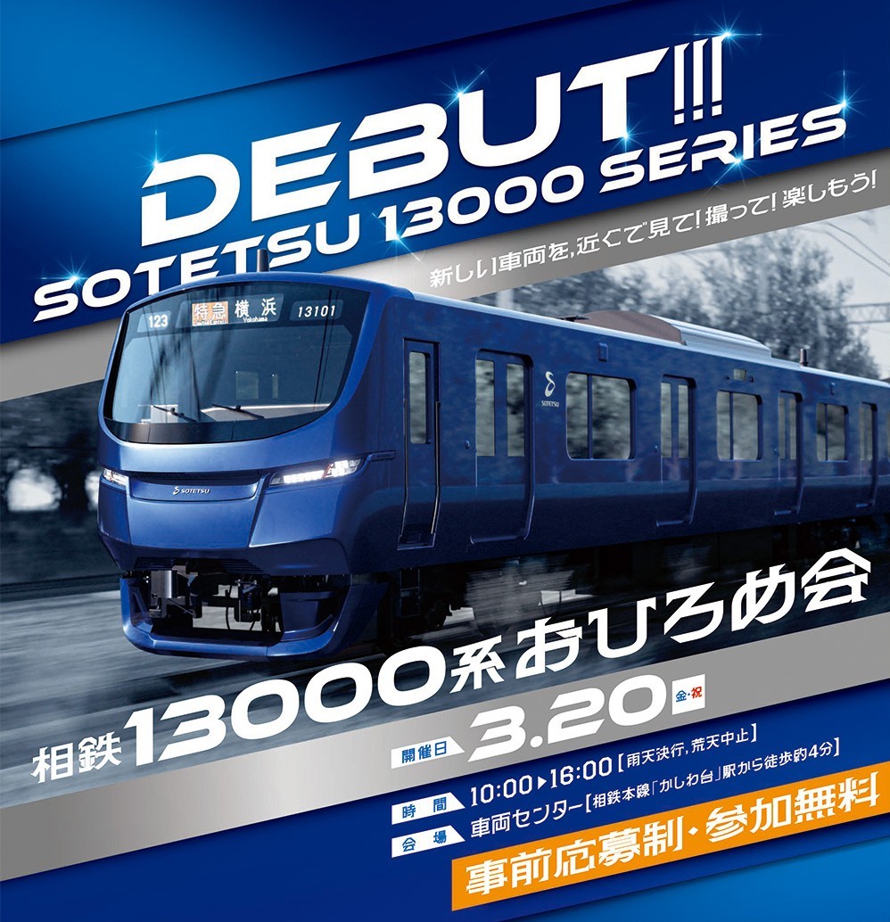 2026年3月20日(金・祝)に相模鉄道車両センターで開催する「相鉄13000系おひろめ会」の開催可否ならびに当日のグッズ販売についてご案内します。